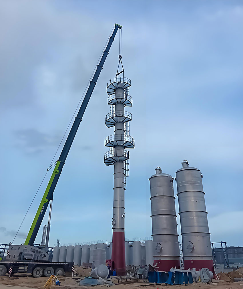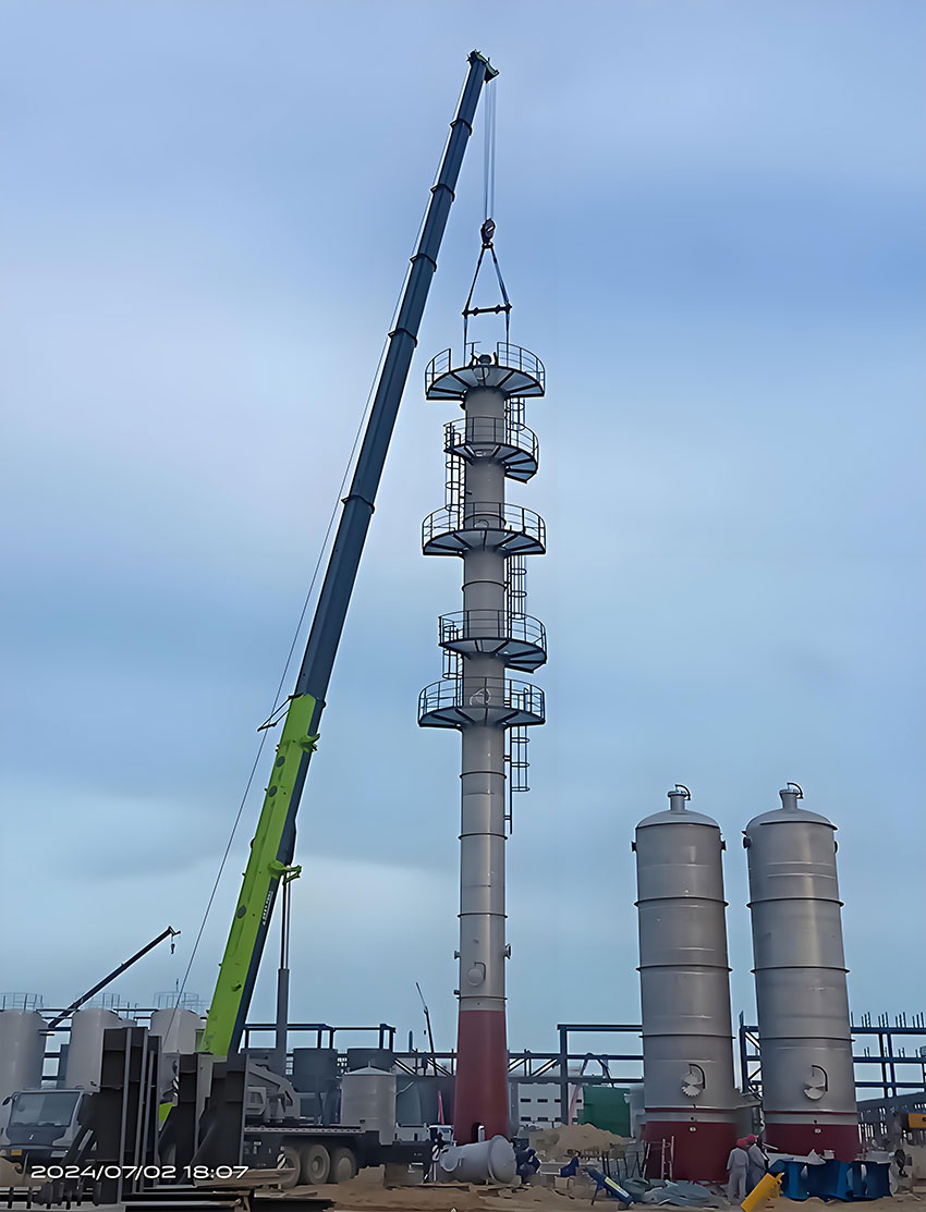 2024年7月2日,由廣東中科天元新能源科技有限公司承建的福建百宏8萬噸/年無水乙醇成套裝置建設(shè)項目中的關(guān)鍵設(shè)備——濃縮塔成功吊裝。