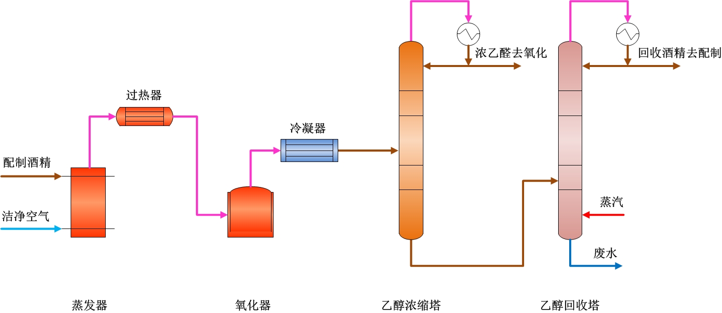配制好的酒精送入蒸發(fā)器蒸發(fā),同時加入空氣,出蒸發(fā)器的氣相混合物經(jīng)過熱后進入氧化器,在催化銀的作用下,乙醇轉(zhuǎn)化為乙醛,乙醛冷凝后進入乙醛濃縮塔,濃縮后的濃乙醛去乙醛氧化工序使用,未反應(yīng)的乙醇通過回收塔回收返回乙醇配制間。