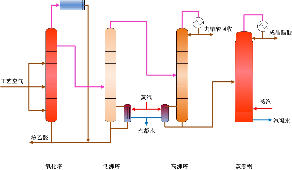 濃乙醛自塔底送入氧化塔,同時加入醋酸錳,氧化塔分為五段,每段均通入空氣,在氧化塔內(nèi),乙醛被氧化成醋酸,塔頂未反應(yīng)氣體進冷凝器,冷凝液回氧化塔底,不凝氣排放,粗醋酸送入低沸器。在低沸塔內(nèi),醋酸錳被分離下來,送回氧化塔,塔頂醋酸蒸汽自塔中部進入高沸塔。乙酸甲酯等低沸物在高沸塔內(nèi)上升至塔頂,冷凝后部分采出的稀酸送入蒸發(fā)鍋。在蒸發(fā)鍋內(nèi),醋酸被蒸發(fā)自塔頂,冷凝、冷卻后即得到成品醋酸,塔釜少量高沸物定期清理。