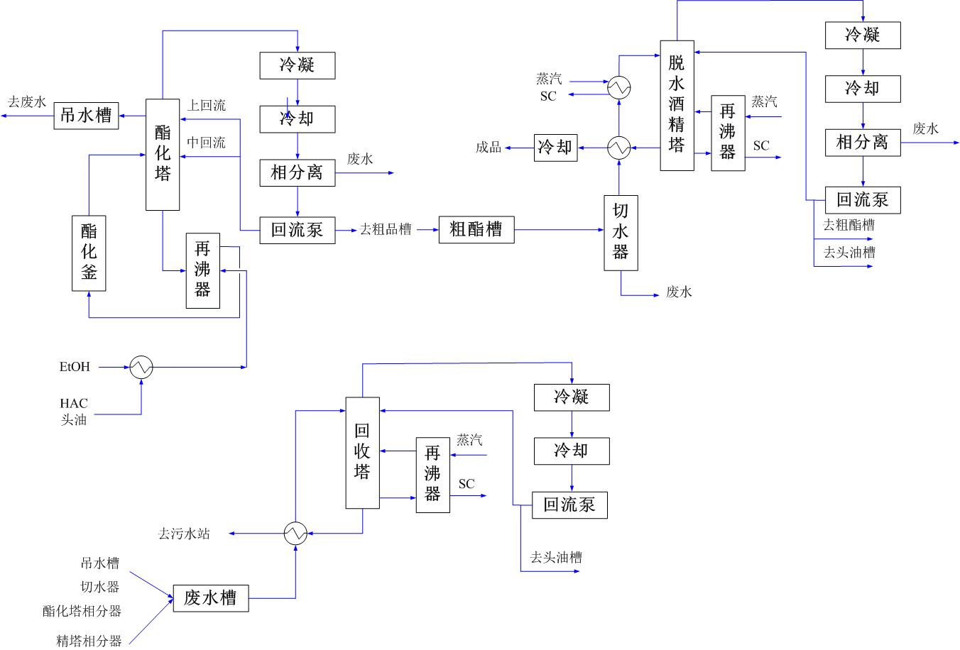 3、脫水精餾共用一個塔,不加磺酸鈉鹽中和反應。