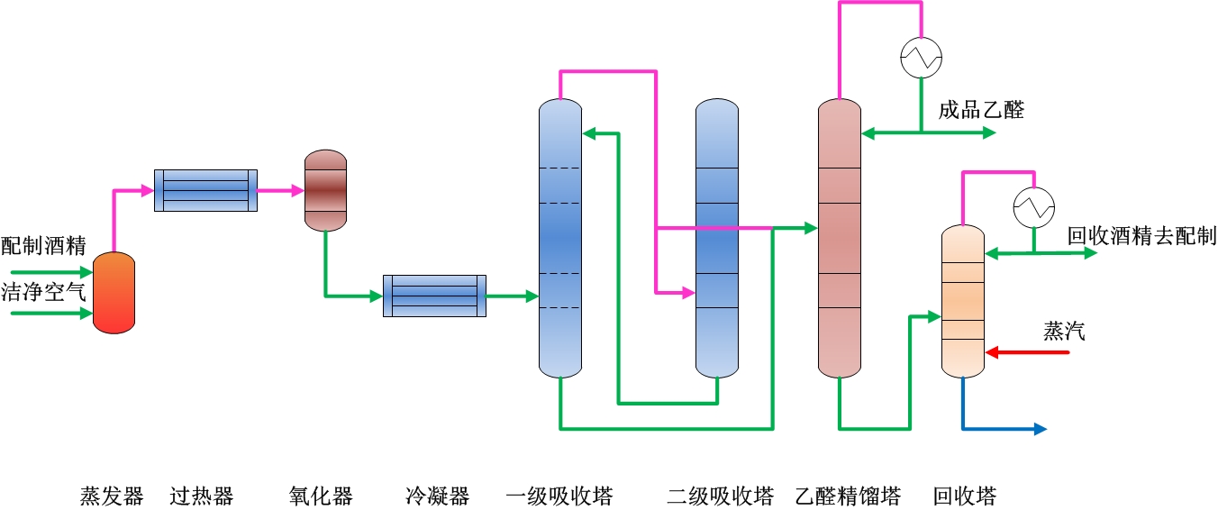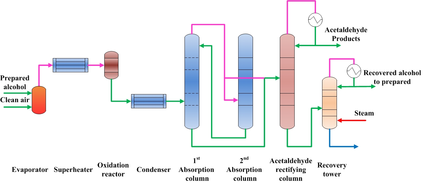 配制好的酒精送入蒸發(fā)器蒸發(fā),同時加入空氣,蒸發(fā)器出來的混合氣體經(jīng)過熱后進入氧化器,在催化劑作用下,乙醇轉(zhuǎn)化為乙醛,反應(yīng)氣體冷凝后再經(jīng)過第一吸收塔和第二吸收塔組成的系統(tǒng)得到稀乙醛。稀乙醛經(jīng)預(yù)熱后進入乙醛精餾塔中部,塔頂醛汽經(jīng)冷卻后一部分回流,一部分成為成品乙醛。未反應(yīng)的乙醇通過回收塔回收返回乙醇配制槽。